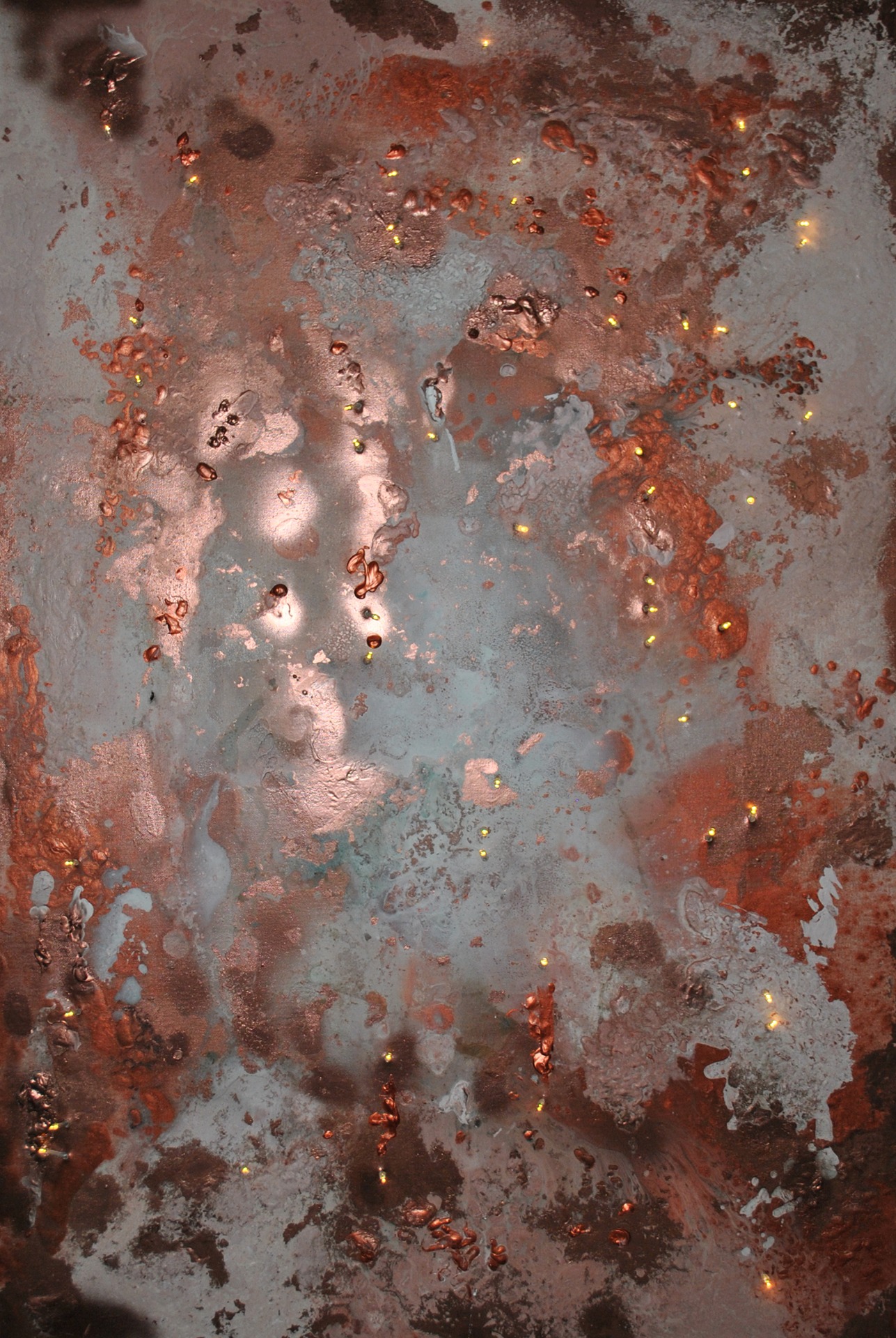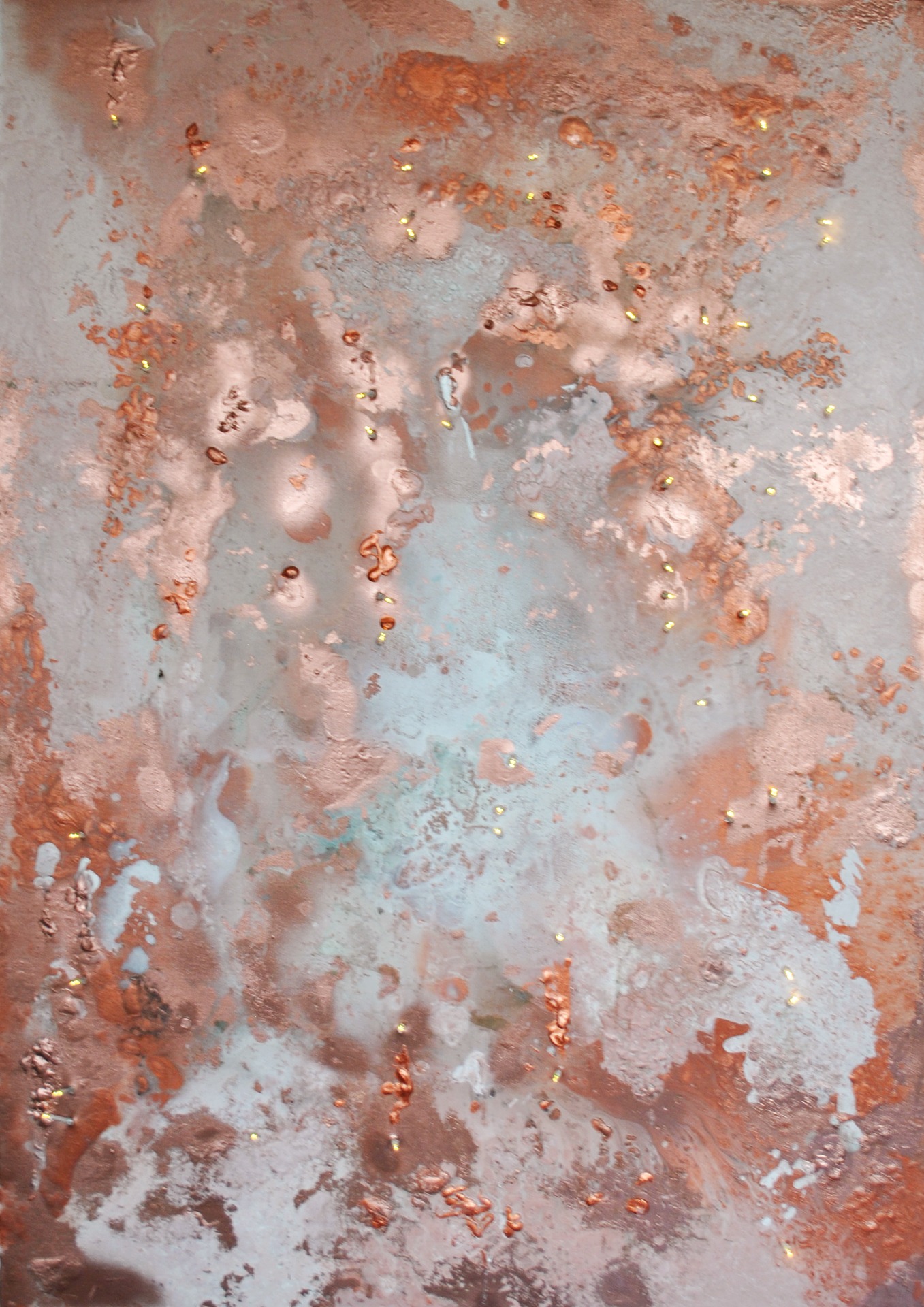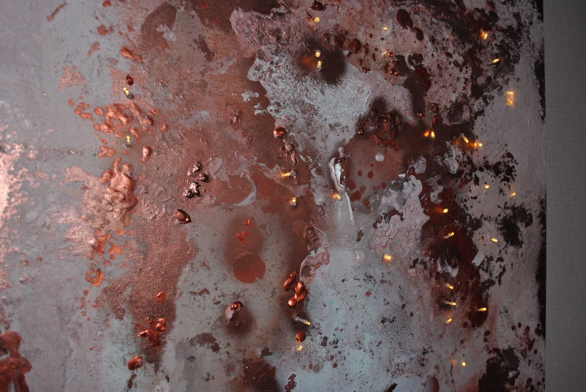 Acrylic, copper spray and LED string lights on canvas, 80cm x 120cm, 2024