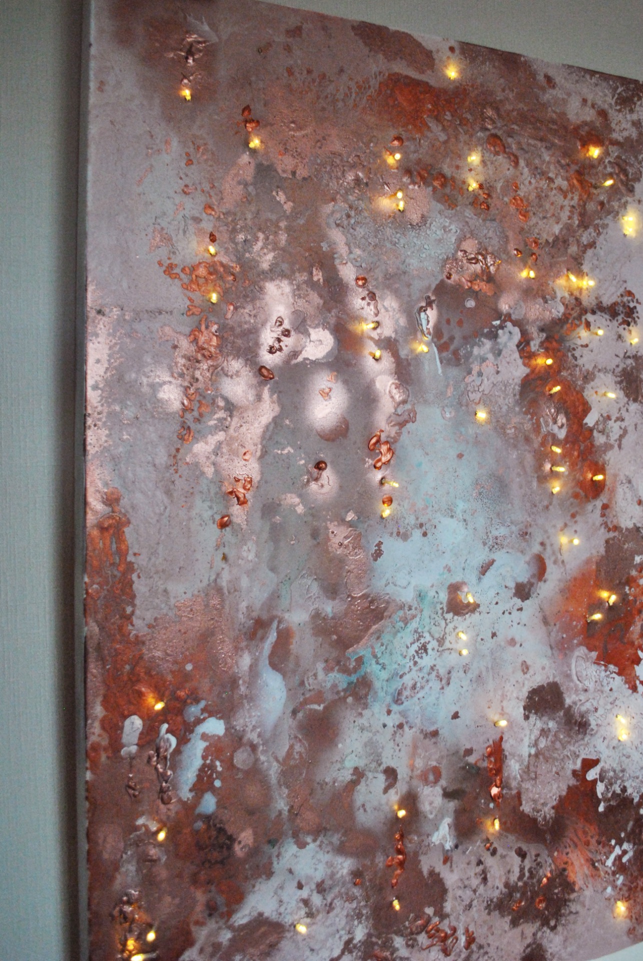 Acrylic, copper spray and LED string lights on canvas, 80 cm x 120 cm, 2024